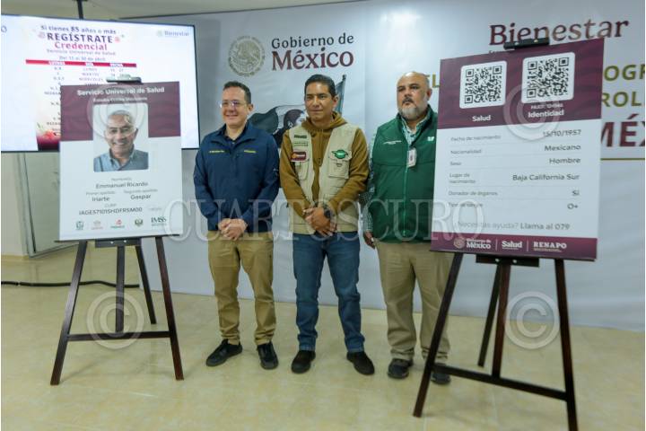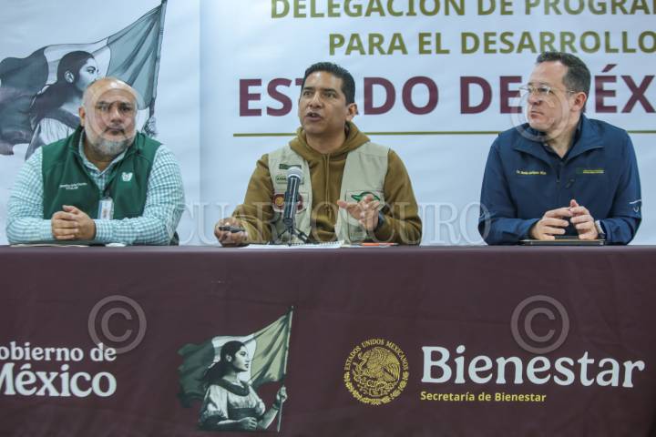 TOLUCA, ESTADO DE MÉXICO, 09ABRIL2026.- Ernesto Armendáriz Ramírez, Delegado de Programas para el Desarrollo en la entidad mexiquense, Natán Enriquez Ríos coordinador estatal de IMSS Bienestar en el Edoméx y Tonatihu Ortíz Castillo titular del IMSS Estado de México Poniente, en conferencia de prensa informaron que el próximo 13 de abril iniciará en Toluca el registro para el Servicio Universal de Salud, en esta primera etapa estará dirigida a personas mayores de 85 años, serán habilitados 9 puntos en la capital mexiquense en puntos estratégicos. FOTO: CRISANTA ESPINOSA AGUILAR/CUARTOSCURO.COM