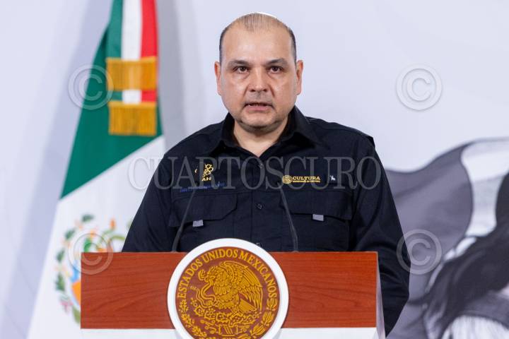 CIUDAD DE MÉXICO, 30MARZO2026.- Joel Vázquez Herrera, director del INAH, Marina Núñez Bespalova, subsecretaria de Desarrollo Cultural de la Secretaría de Cultura, habló sobre el programa de mejoramiento de museos y Zonas Arqueológicas, durante la Mañanera del Pueblo. FOTO: MOISÉS PABLO/CUARTOSCURO.COM