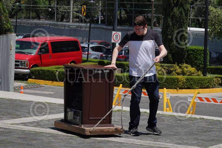 CIUDAD DE MÉXICO, 14ABRIL2026.- Trabajadores retiraron utilera que se había colocado para una supuesta conferencia a medios, convocada por integrantes del partido Morena, esto luego de la denuncia presentada por representantes del Partido Acción Nacional ante el Instituto nacional Electoral, en el cual se denuncia al diputado de Morena, Arturo Avila Anaya, esto ante la ofíciala de partes de partes del instituto en Tlalpan. FOTO: ROGELIO MORALES/CUARTOSCURO.COM