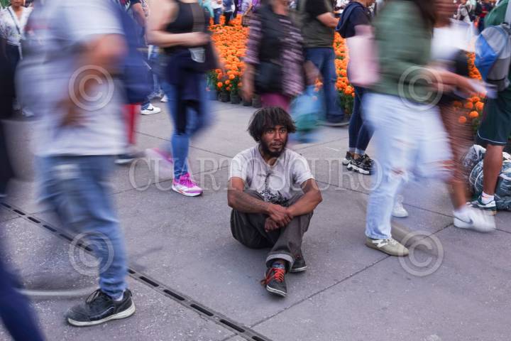 CIUDAD DE MÉXICO, 29ENERO2026.- Un joven permanece sentado en la plancha del Zócalo capitalino y observa un espectáculo, mientras a su alrededor la multitud transita difusa y en movimiento. FOTO: CAMILA AYALA BENABIB / CUARTOSCURO.COM