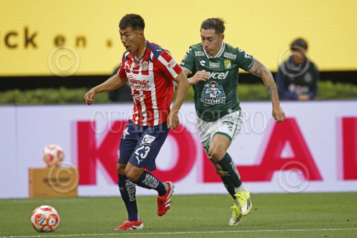 ZAPOPAN, JALISCO, 18MARZO2026.- Daniel Aguirre jugador de Chivas disputa el balón con el contrario de León José Rodríguez, esto en partido pendiente correspondiente a la jornada 9 del Torneo Clausura 2026 de la Liga MX, en donde se enfrentan los equipos de Chivas vs León y en juego que se lleva a cabo en el Estadio Akron, el marcador al final es de 5-0, a favor de Chivas. FOTO: FERNANDO CARRANZA GARCIA / CUARTOSCURO.COM