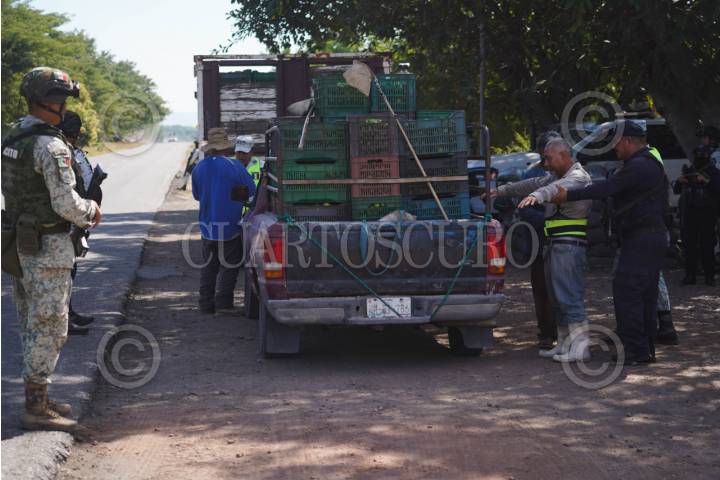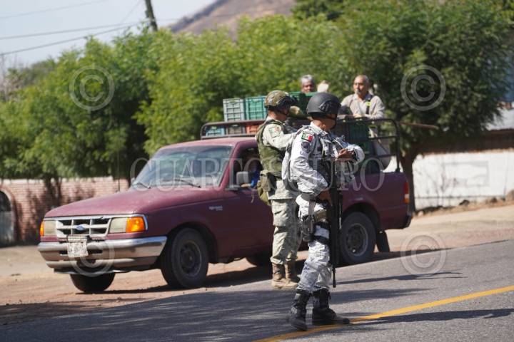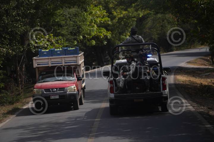 BUENAVISTA TOMATLÁN, MICHOACÁN, 24ENERO2026.- Los patrullajes y operativos de la Guardia Nacional, el Ejército Mexicano y la Guardia Civil continúan y se han intensificado en Apatzingán y la región de Tierra Caliente tras la detención de César Alejandro "N", alias "El Botox", ocurrida el 22 de enero de 2026. Aseguramiento de Inmuebles: Tras la captura, las autoridades han ejecutado órdenes de cateo en al menos 19 a 24 propiedades vinculadas al líder de "Los Blancos de Troya" en localidades como Cenobio Moreno. La situación actual en la zona se reporta bajo los siguientes puntos clave: Vigilancia y Blindaje: Se mantiene un despliegue de más de 30 unidades terrestres y aeronaves de la Guardia Nacional que realizan sobrevuelos para prevenir reacciones violentas. Las actividades comerciales, educativas y de la industria limonera operan con normalidad bajo el resguardo de filtros de revisión estratégicos. FOTO: JUAN JOSÉ ESTRADA SERAFÍN/CUARTOSCURO.COM
