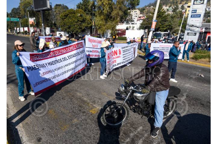 TOLUCA, ESTADO DE MÉXICO, 03DICIEMBRE2025.- Maestros integrantes del SMSEM se manifestaron en las instalaciones de la Coordinación Estatal de Servicio Profesional Docente en Toluca y bloquearon la avenida Sebastián Lerdo de Tejada y Miguel Hidalgo, exigiendo transparencia en el proceso de Promoción Horizontal. FOTO: CRISANTA ESPINOSA AGUILAR/CUARTOSCURO.COM