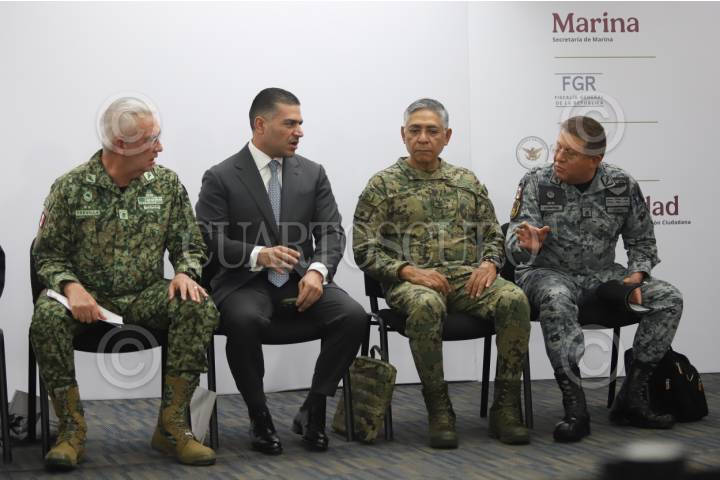 CIUDAD DE MÉXICO, 14DICIEMBRE2025.- El secretario de Seguridad y Protección Ciudadana, Omar García Harfuch, el secretario de la Defensa, Ricardo Trevilla Trejo, el secretario de Marina, Raymundo Morales y el titular de la Guardia Nacional, durante la conferencia de prensa que organizó el gabinete de seguridad este domingo. FOTO: DANIEL AUGUSTO/ CUARTOSCURO.COM