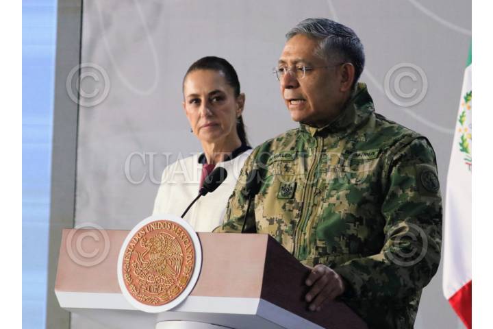 CUERNAVACA, MORELOS, 08ENERO2026.- La presidenta Claudia Sheinbaum Pardo llegó a la 24 Zona Militar, donde se llevó a cabo la conferencia matutina "Mañanera del pueblo". La primera mandataria estuvo acompañada de la gobernadora Margarita González Saravia y del gabinete de seguridad. Durante la conferencia se anunció una disminución del 40 por ciento en homicidios dolosos en el país. En la imagen el almirante Raymundo Morales, titular de Marina. FOTO: MARGARITO PÉREZ RETANA/CUARTOSCURO.COM