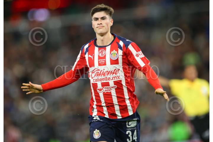 GUADALUPE, NUEVO LEÓN, 21MARZO2026.- Armando González de las Chivas del Guadalajara, festeja el gol ante los Rayados del Monterrey, en el estadio BBVA, partido correspondiente a la jornada 12 de la Clausura 2026. Marcador Final: Monterrey: 2 - Chivas: 3. FOTO: GABRIELA PÉREZ MONTIEL / CUARTOCURO.COM
