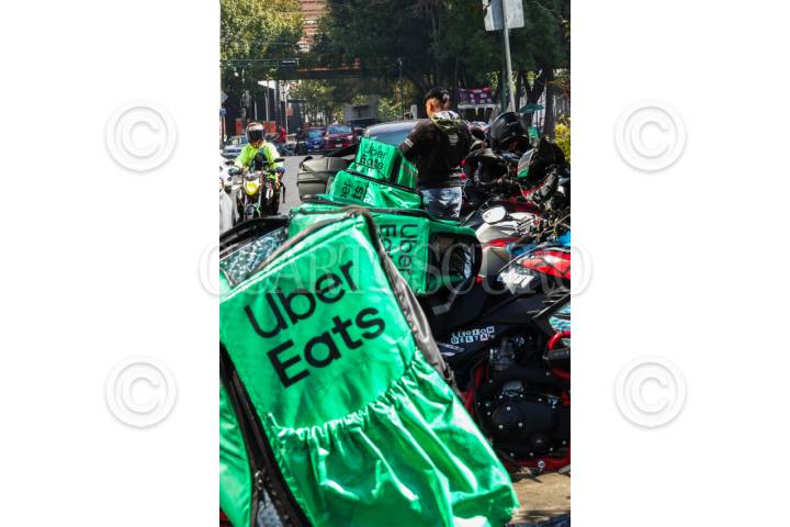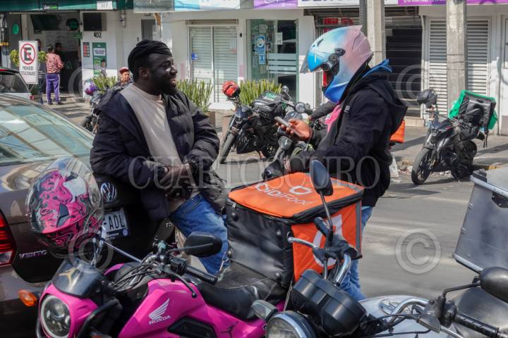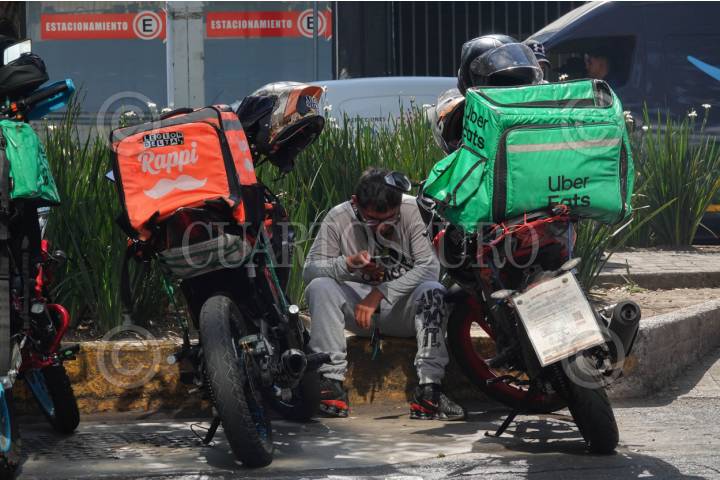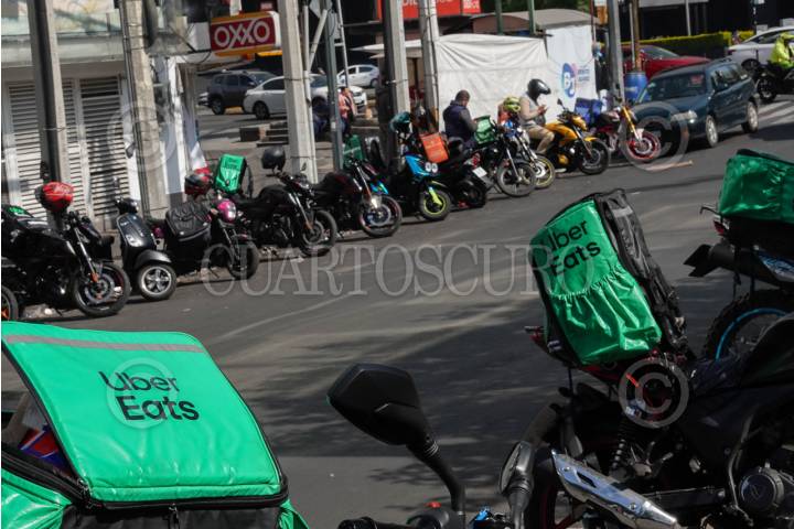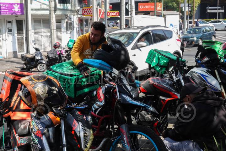 CIUDAD DE MÉXICO, 31DICIEMBRE2025.- A partir de 2026, los choferes repartidores de aplicaciones en moto podrán solicitar su afiliación al IMSS. En la imagen, repartidores de aplicaciones se reúnen a la espera de pedidos afuera de una sucursal de Casa de Toño, ubicada en Calzada Obrero Mundial, esquina con Cuauhtémoc. FOTO: CAMILA AYALA BENABIB / CUARTOSCURO.COM