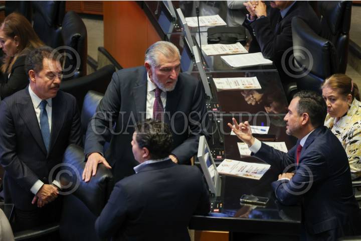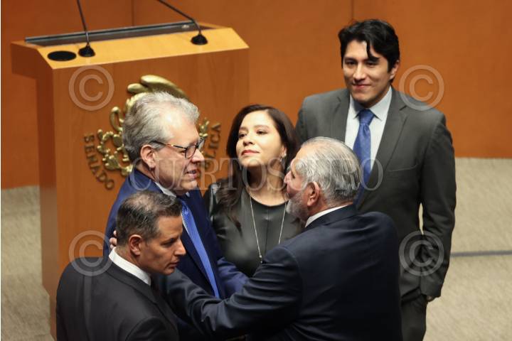 CIUDAD DE MÉXICO, 28OCTUBRE2025.- Ignacio Mier, vicecoordinador de Morena, Adán Augusto López, coordinador morenista en el Senado, y el senador Miguel Ángel Yunes Márquez al termino de la Sesión Solemne del Senado de la República con motivo de los 80 años de fundación de la Organización de las Naciones Unidas (ONU). FOTO: GALO CAÑAS/CUARTOSCURO.COM