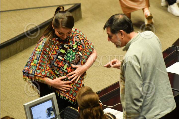 CIUDAD DE MÉXICO, 02DICIEMBRE2025.- Jasmine María Bugarín, senadora del PVEM, muestra su atuendo a Gerardo Fernández Noroña, senador del PT, durante la sesión ordinaria de la Cámara de Senadores en la que se discute el acuerdo del listado de 10 personas candidatas y candidatos para ocupar el cargo de titular de la Fiscalía General de la República. FOTO: MARIO JASSO/CUARTOSCURO.COM