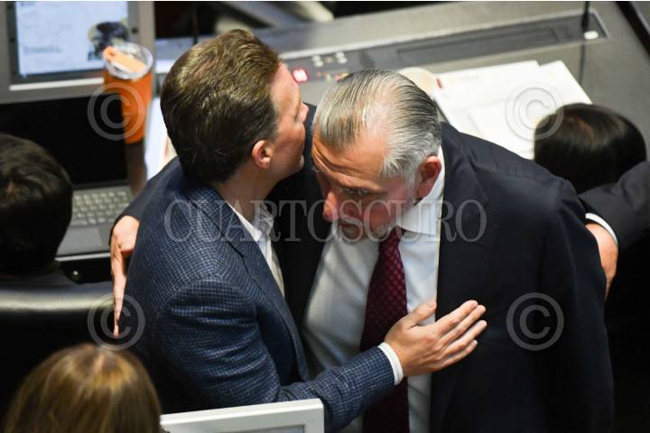 CIUDAD DE MÉXICO, 02DICIEMBRE2025.- Los senadores Manuel Velasco (PVEM) y Adán Augusto López (Morena) se saludan durante la sesión ordinaria de la Cámara de Senadores en la que se discute el acuerdo del listado de 10 personas candidatas y candidatos para ocupar el cargo de titular de la Fiscalía General de la República. FOTO: MARIO JASSO/CUARTOSCURO.COM