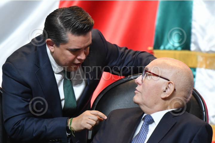 CIUDAD DE MÉXICO, 26AGOSTO2025.- Francisco Cervantes, presidente del CCE, dialoga con el coordinador de la bancada del Partido Verde en el Senado, Manuel Velasco, durante la reunión plenaria de los legisladores del PVEM. FOTO: DANIEL AUGUSTO/ CUARTOSCURO.COM