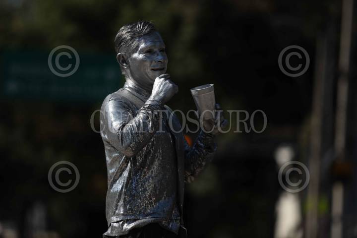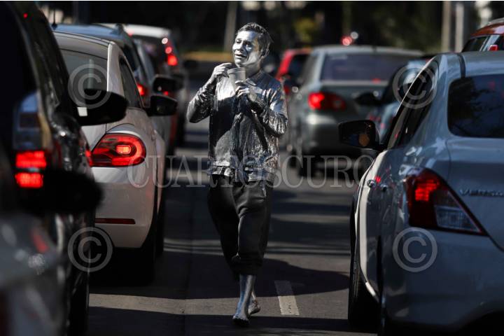 CIUDAD DE MÉXICO, 08FEBRERO2026.- Una estatua viviente, conocido como Los plateados, se gana unas monedas realizando expresiones corporales en el semáforo de División del Norte, alcaldía Benito Juárez. FOTO: GRACIELA LÓPEZ/CUARTOSCURO.COM