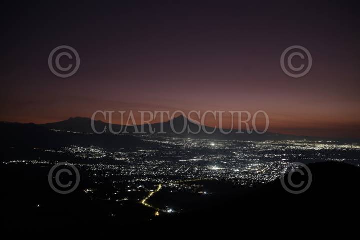 OCUILAN DE ARTEAGA, ESTADO DE MÉXICO, 15FEBRERO2026.- Amanecer desde la comunidad del Capulín, en la imagen se ven el volcán Popocatépetl y la ciudad de Cuernavaca cubierta de contaminación. FOTO: MARGARITO PÉREZ RETANA/CUARTOSCURO.COM