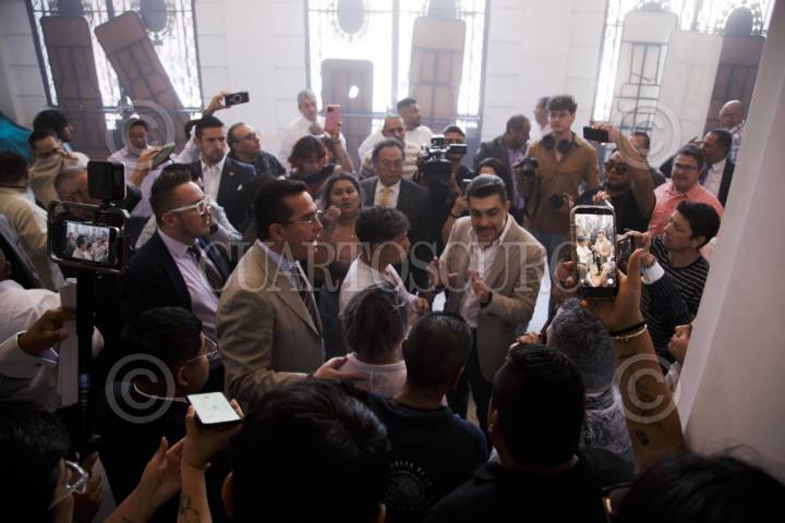 CIUDAD DE MÉXICO, 09ABRIL2026.- Integrantes de Asamblea de Barrios, quienes solicitan vivienda, intentaron dar portazo en el Congreso de la capital, lo que ocasionó una quiebra de vidrios y uso de extintores por parte del personal de resguardo para evitar el ingreso de los manifestantes. En la imagen, Jesús Sesma, presidente de la mesa directiva, conversa dialogo con manifestantes. FOTO: ALBERTO RODRÍGUEZ/CUARTOSCURO.COM