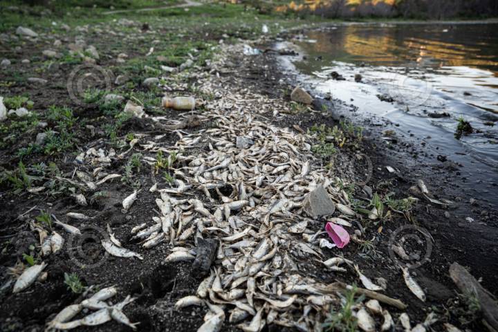 TIJUANA BAJA CALIFORNIA 15ENERO2025.-Miles de peces muertos fueron observados en las orillas de la Presa Abelardo L. Rodríguez, en Tijuana, donde los restos de sardinas se mezclan con basura como plásticos, ropa y llantas, además de percibirse un fuerte olor por su descomposición. Usuarios que acuden a la zona para realizar actividades recreativas y deportivas, a la altura de la colonia Colinas de La Presa, alertaron sobre la mortandad de la fauna acuática y la evidente contaminación, la cual podría estar relacionada con bajos niveles de oxígeno en el agua y descargas de aguas negras que desembocan en el vaso de la presa. FOTOS JOSÉ VARGAS /CUARTOSCURO.COM