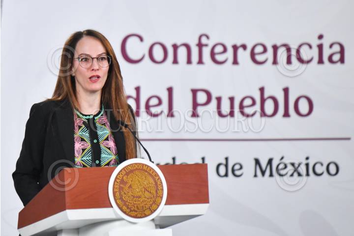 CIUDAD DE MÉXICO, 20ABRIL2026.- Tania Rodriguez, subsecretaria de Educación Media Superior, expone los resultados del programa "Mi Derecho, Mi Lugar" durante la Conferencia del Pueblo de este lunes en Palacio Nacional. FOTO: DANIEL AUGUSTO/ CUARTOSCURO.COM