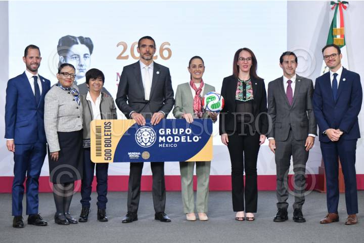 CIUDAD DE MÉXICO, 10ABRIL2026.- Raúl Escalante, vicepresidente legal de asuntos corporativos de Grupo Modelo; Rosa Isela Rodríguez Velazquez, secretaria de Gobernación; Edna Elena Vega Rangel, secretaria de Desarrollo Agrario, Territorial y Urbano; Daniel Cocenzo, presidente de Grupo Modelo; Claudia Sheinbaum, presidenta de México; Gabriela Cuevas Barrón, Coordinadora de los Trabajos del Gobierno Federal para el Mundial 2026; Rommel Aghmed Pacheco Marrufo, director general de la Comisión Nacional de Cultura Física y Deporte (CONADE), y José Alfaro, director de asuntos corporativos de Grupo Modelo, durante la conferencia matutina en la que Grupo Modelo anunció que regalará 500 boletos para el Mundial 2026 a los ganadores de los distintos torneos del Mundial Social, la instalación de pantallas móviles en todo el país y otorgará 35 mil licencias para transmitir los partidos del mundial en restaurantes. FOTO: MARIO JASSO/CUARTOSCURO.COM
