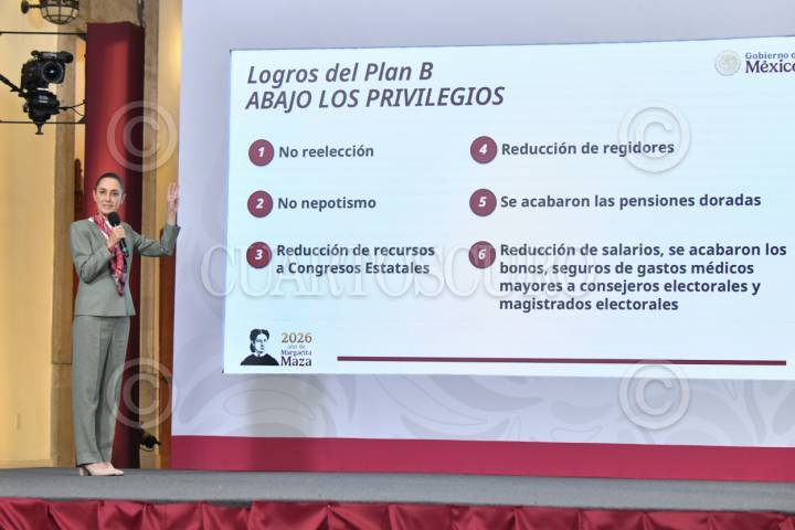 CIUDAD DE MÉXICO, 10ABRIL2026.- Claudia Sheinbaum, presidenta de México, durante su intervención en la conferencia matutina compartió los seis puntos principales del Plan B de la Reforma Electoral aprobada recientemente en la Cámara de Diputados. FOTO: MARIO JASSO/CUARTOSCURO.COM