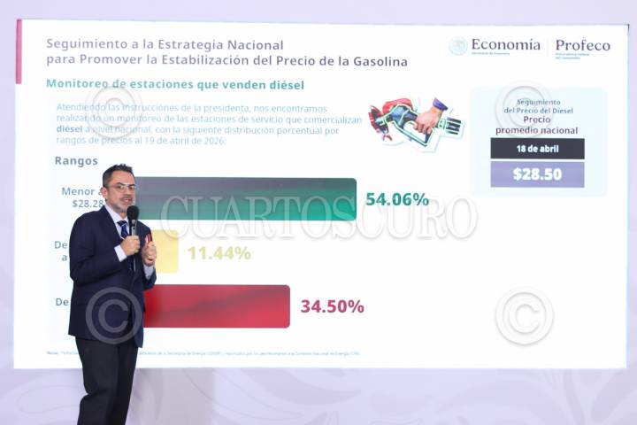 CIUDAD DE MÉXICO, 20ABRIL2026.- Durante la sección Quién es Quién en los Combustibles, de la Profeco, la presidenta de México, Claudia Sheinbaum, hizo mención del alto precio del diésel y anunció que se reunirá con gasolineros en los siguientes días para dialogar con ellos. FOTO: DANIEL AUGUSTO/ CUARTOSCURO.COM