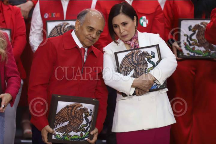 CIUDAD DE MÉXICO, 18MARZO2026.- Rosario Robles, economista y política, recibió un escudo nacional por parte de Alejandro Moreno, presidente del Partido Revolucionario Institucional, durante la conferencia de prensa que ofreció el dirigente y militantes de este partido en la cede del PRI. FOTO: GRACIELA LÓPEZ/CUARTOSCURO.COM
