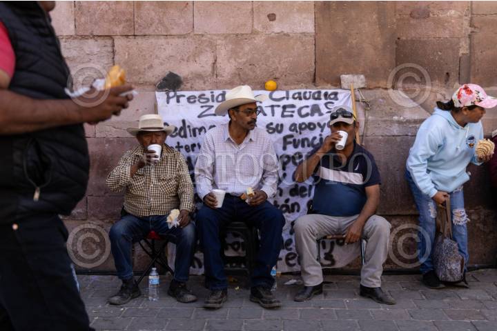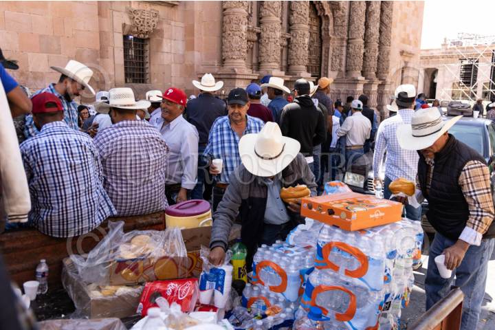 ZACATECAS, ZACATECAS, 27MARZO2026.- Productores de frijol mantienen un plantón en la Plaza de Armas del centro histórico. Después de medio día autoridades estatales y federales aceptaron una mesa de negociación para tratar de resolver la problemática del acopio y que los agricultores puedan entregar su semilla. El día de mañana en la plaza se inaugura el Festival Cultual de Zacatecas 2026, por lo que la presión de los frijoleros sentó a las autoridades después de 10 días de bloqueos y manifestaciones. A lo largo del día, colectivos y ciudadanos solidarios han llegado al lugar para entregar café , fruta, pan, comida y agua, por lo que los productores se han sentido respaldados. FOTO: ADOLFO VLADIMIR /CUARTOSCURO.COM
