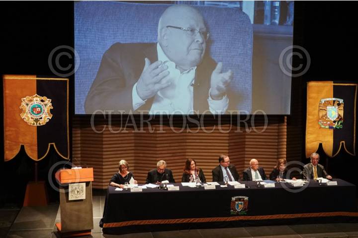 CIUDAD DE MÉXICO, 10FEBRERO2026.- Se llevó a cabo la ceremonia de entrega del Reconocimiento Universitario al sociólogo y maestro de la UNAM Gerardo Estrada Rodríguez, por su labor en la promoción cultural y su trayectoria intelectual, en el auditorio del Museo Universitario Arte Contemporáneo (MUAC). El reconocimiento fue entregado por el rector de la Universidad Nacional Autónoma de México, Leonardo Lomelí Vanegas. Durante el evento participaron José Woldenberg, ex presidente del Instituto Federal Electoral; la periodista Adriana Malvido; la gestora cultural Graciela de la Torre, y el economista Rolando Cordera. FOTO: CAMILA AYALA BENABIB / CUARTOSCURO.COM