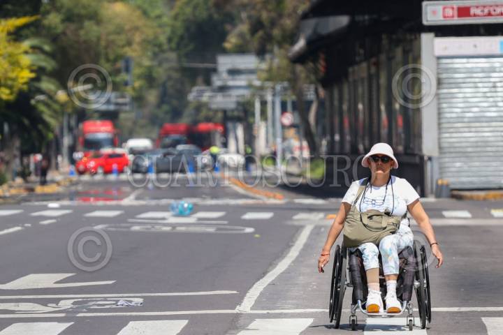 CIUDAD DE MÉXICO, 21OCTUBRE2025.- Una mujer en silla de ruedas que se transportaba en el Metrobús tuvo que terminar su recorrido rodando sobre el asfalto de avenida Insurgentes debido a que el servicio de la Línea se suspendió debido a un bloqueo en avenida reforma e Insurgentes. FOTO: MOISÉS PABLO/CUARTOSCURO.COM