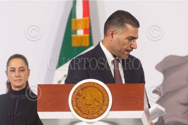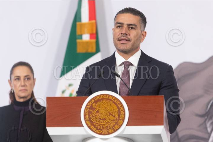 CUERNAVACA, MORELOS, 08ENERO2026.- Omar García Harfuch, secretario de Seguridad y protección ciudadana en la conferencia se anunció una disminución del 40 por ciento en homicidios dolosos en el país. FOTO: MARGARITO PÉREZ RETANA/CUARTOSCURO.COM