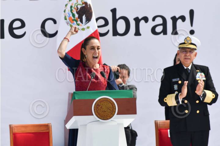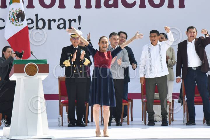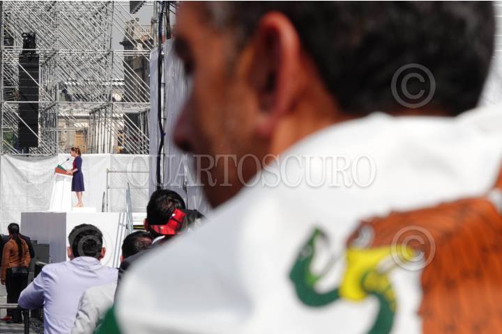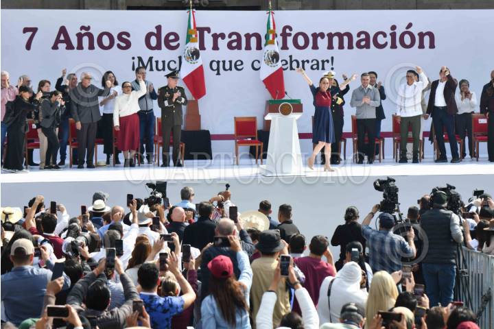 CIUDAD DE MÉXICO, 06DICIEMBRE2025.- Claudia Sheinbaum, presidenta de México, encabezó ante miles de simpatizantes en el zócalo capitalino un mensaje por los "7 años de transformación", evento que conmemora la llegada al gobierno federal de la coalición conformada por Morena, PT y PVEM. FOTO: MARIO JASSO/CUARTOSCURO.COM