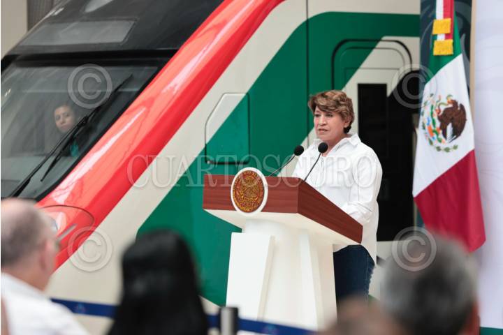 CIUDAD DE MÉXICO, 26ABRIL2026.- Delfina Gómez, gobernadora del Estado de México, durante su discurso en la ceremonia de inauguración del Tren Felipe Ángeles Buenavista-AIFA. Con este transporte los usuarios del Aeropuerto Internacional Felipe Ángeles harán 60 minutos de la estación Buenavista y tendrá un costo de 45 pesos, aunque esta tarifa solo es promocional por la inauguración de operaciones. FOTO: PRESIDENCIA/CUARTOSCURO.COM