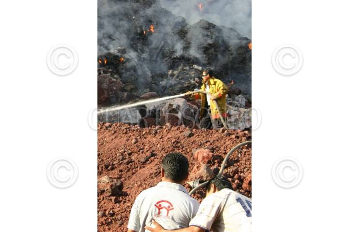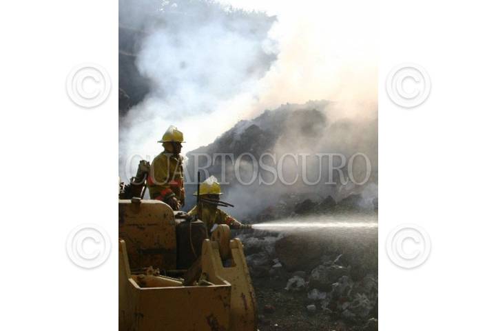 JIUTIPEC, MORELOS. 20ABRIL2007.- Elementos de la Dirección de Protección Civil, bomberos de CIVAC y Cuernavaca; participaron en las acciones para controlar el incendio que se registro en un predio utilizado como tiradero clandestino, ubicado en la calle Tezontepec conocido como "Mina Tezontle", se han acumulado desechos urbanos, que ante el incremento de las altas temperaturas, fueron campo fértil para el incendio. FOTO: JORGE GARCÍA/CUARTOSCURO.COM
