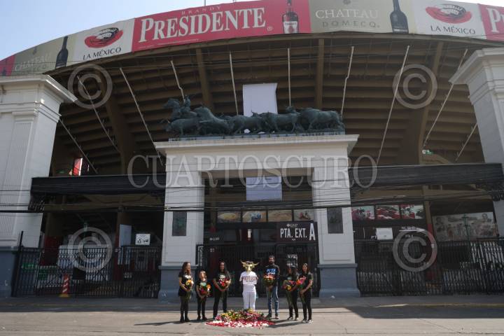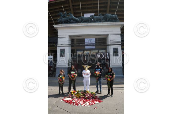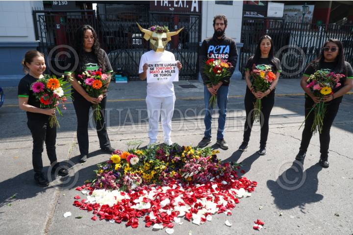 CIUDAD DE MÉXICO, 02FEBRERO2026.- Integrantes de PETA Latino realizaron un performance frente a la Plaza de Toros de México. El acto incluyó a una persona con una máscara de toro que sostenía un cartel con la leyenda “En este lugar se torturó y mató a miles de toros”, así como una ofrenda floral. Actualmente, las corridas de toros se encuentran prohibidas debido a una reforma legal que prohíbe espectáculos en los que sufran animales. FOTO: MOISÉS PABLO/CUARTOSCURO.COM