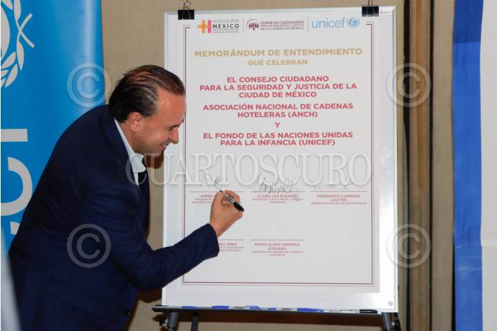 CIUDAD DE MÉXICO, 01DICIEMBRE2025.- Jorge Paoli Díaz, presidente ANCH y CEO grupo Diestra; Clara Luz Álvarez, secretaria ejecutiva del consejo ciudadano para la seguridad y justicia de la Ciudad de México, y Fernando Carrera Castro, Representante UNICEF, firmaron el “Memorándum de entendimiento rumbo al mundial 2026”. FOTO: TOMÁS PÉREZ DE LA CRUZ/CUARTOSCURO.COM