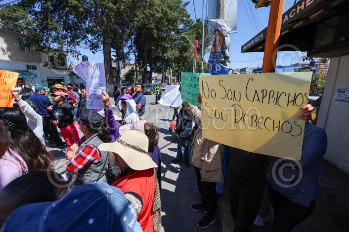 ZINACANTEPEC, ESTADO DE MÉXICO, 27MARZO2026.- Vecinos de la cabecera municipal de Zinacantepec, Santa María del Monte, Zinacantepec, Acahualco y San Luis Mextepec se manifestaron denunciando el abasto irregular de agua potable desde hace tres años, inseguridad, obras inconclusas, falta de rehabilitación de caminos, entre otras necesidades que tiene la población. FOTO: CRISANTA ESPINOSA AGUILAR/CUARTOSCURO.COM