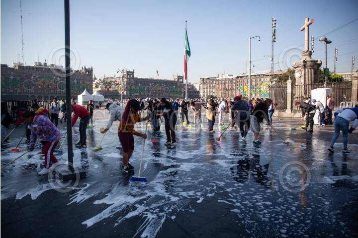 CIUDAD DE MÉXICO, 07ENERO2026.- Termina la temporada alta para los comerciantes que tuvieron permisos de venta en las inmediaciones del Zócalo capitalino por lo que desde temprana hora están limpiando la zona de venta con agua jabón y tallando para entregar la zona limpia. FOTO: ANDREA MURCIA /CUARTOSCURO.COM