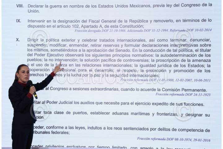 CIUDAD DE MÉXICO, 06DICIEMBRE2026.- La presidenta Claudia Sheinbaum Pardo muestra el artículo constitucional que habla sobre la postura respecto a invasiones y el respeto al derecho internacional, durante la conferencia mañanera desde Palacio Nacional en la que atendió preguntas referentes a la situación del presidente Nicolas Maduro. FOTO: GALO CAÑAS/CUARTOSCURO.COM