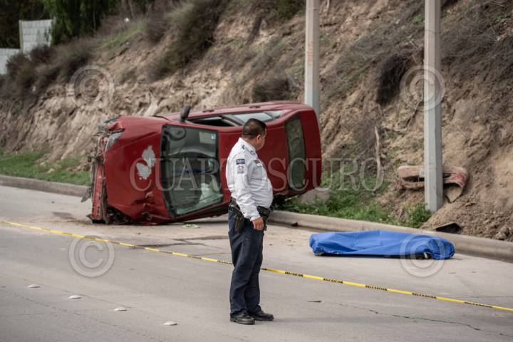 TIJUANA BAJA CALIFORNIA 02ENERO2026.-Un conductor murió tras volcarse el vehículo que conducía sobre el Libramiento Sur, en dirección al Soler. Paramédicos de la Cruz Roja y elementos del Cuerpo de Bomberos llegaron al lugar y le realizaron maniobras de reanimación; sin embargo, el hombre, de entre 35 y 40 años de edad, fue declarado sin vida en el lugar. El vehículo, un Ford Focus rojo con placas de Baja California, terminó volcado sobre la vialidad, quedando la escena a cargo de Servicios Periciales de la Fiscalía General del Estado. FOTOS CHRIS NOYOLA/CUARTOSCURO.COM