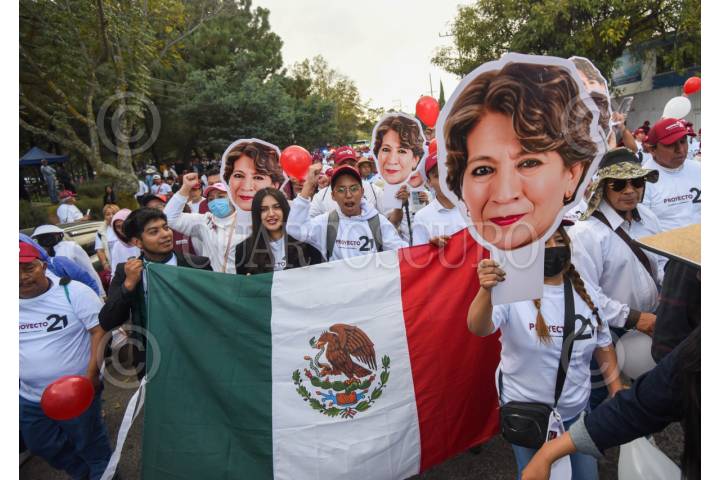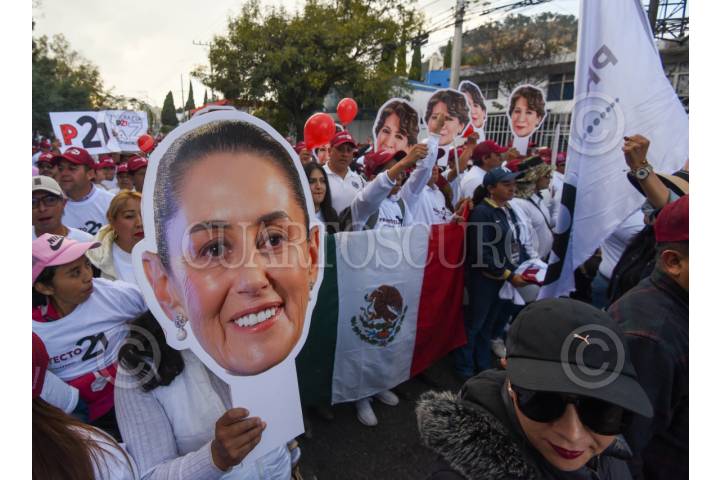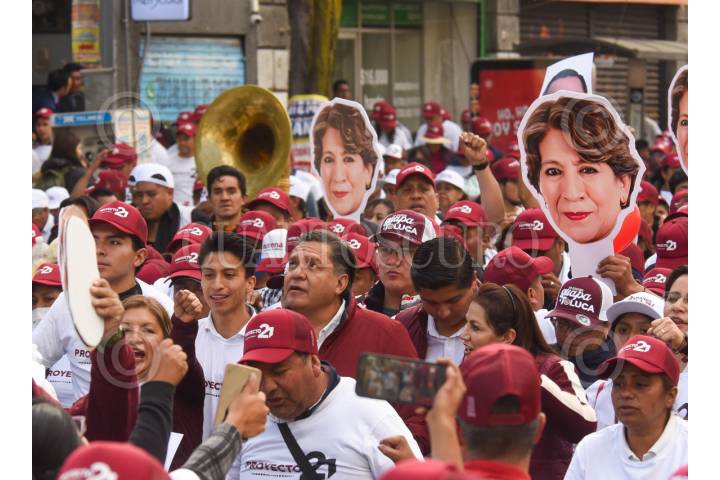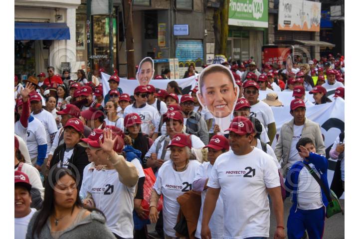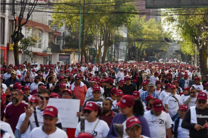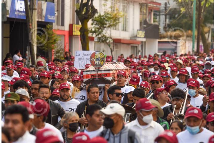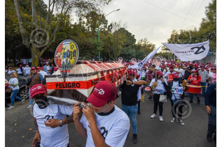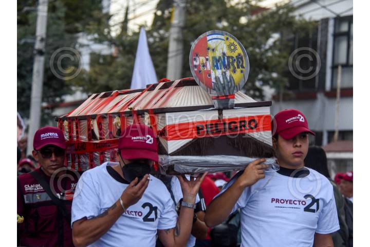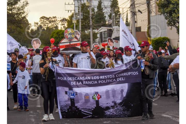 TOLUCA, ESTADO DE MÉXICO, 03DICIEMBRE2025.- Morenistas de Toluca salieron a respaldar a la presidenta Claudia Sheinbaum, a la gobernadora mexiquense Delfina Gómez Álvarez y al alcalde Ricardo Moreno, caminando por las principales calles de la ciudad cargando un ataúd con logos de los partidos del PRI, PAN, PRD y MC, así como fotos de la presidenta y la gobernadora respaldando a la 4T después de diversas marchas que se han registrado a nivel nacional en contra del Gobierno Federal. FOTO: CRISANTA ESPINOSA AGUILAR/CUARTOSCURO.COM