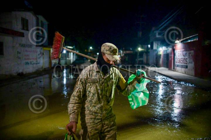 POZA RICA, VERACRUZ, 15OCTUBRE2025.- Elementos del Ejército Mexicano continúan con las labores de limpieza en la colonia Poza de Cuero, una de las más afectadas por el desbordamiento del río Cazones en Poza Rica. FOTO: CUARTOSCURO.COM