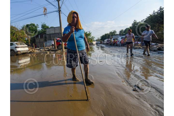 ÁLAMO, VERACRUZ, 18OCTUBRE2025.- Una mujer apoyada de un palo camina entre el lodo en el municipio veracruzano de Álamo, en donde continúan los trabajos de limpieza en sus comunidades, las cuales se vieron afectadas por las lluvias. FOTO: CRISANTA ESPINOSA AGUILAR/CUARTOSCURO.COM
