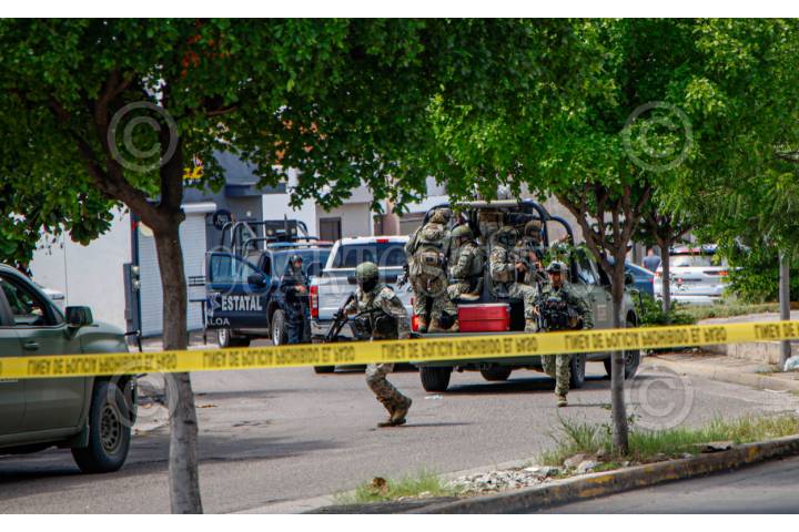 CULIACÁN, SINALOA, 21SEPTIEMBRE2025.- Una tarde de fuego cruzado sacudió el fraccionamiento Villas del Real, al oriente de Culiacán, donde un enfrentamiento entre elementos de la Secretaría de la Defensa Nacional y un grupo armado dejó como saldo preliminar una persona muerta, dos detenidos uno de ellos herido por arma de fuego y un vehículo con impactos de bala, armas y equipo táctico asegurado. La víctima fatal fue localizada dentro de una vivienda en la calle Rey Guillermo Primero, aunque hasta el momento se desconoce si se trataba de un rehén o de un presunto agresor, pues la causa de muerte fue atribuida a golpes. Mientras tanto, otro hombre herido fue trasladado a un hospital sin que se precisaran las circunstancias de su lesión. En paralelo, un automóvil abandonado con arsenal en su interior fue localizado en Camino Real. FOTO: JOSÉ BETANZOS ZÁRATE/CUARTOSCURO.COM