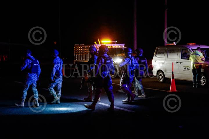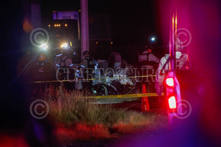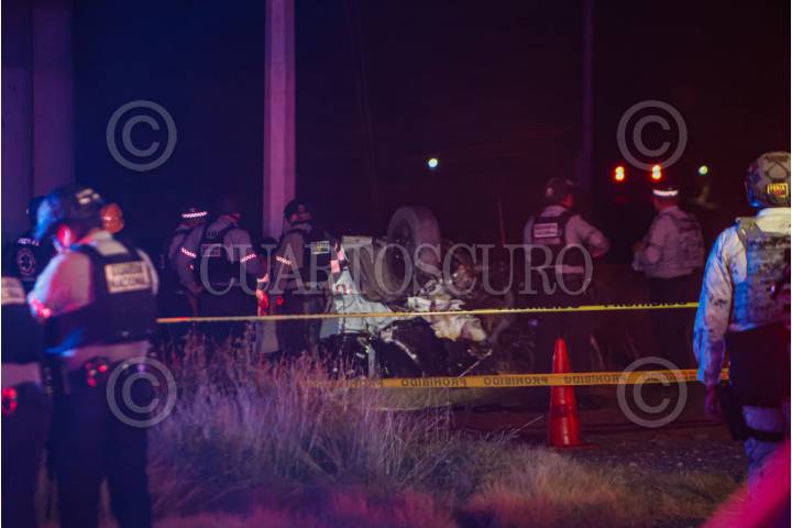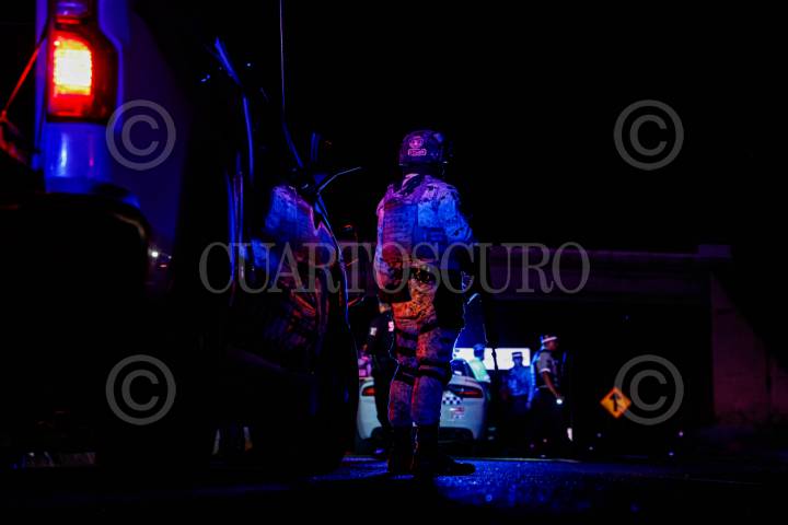 CULIACÁN, SINALOA, 20OCTUBRE2025. - Una persecución entre elementos de la Guardia Nacional y civiles armados terminó en tragedia la tarde de este lunes, cuando una patrulla oficial volcó sobre la Maxipista Culiacán–Mazatlán, a la altura del trébol de la sindicatura de Costa Rica. El accidente dejó como saldo un agente fallecido, identificado como el sargento Julián ‘N’, y otro lesionado de nombre Luis Abel ‘N’, quien fue trasladado a un hospital. El vehículo tipo Charger de la División de Caminos quedó con las llantas hacia arriba y severamente dañado, mientras que el agente fallecido quedó prensado en su interior. La persecución se originó tras el reporte de civiles armados a bordo de un Audi gris que circulaba en dirección sur, cerca del tramo de la caseta de Costa Rica. La escena fue acordonada por elementos del Ejército Mexicano, Guardia Nacional, SSPC y paramédicos voluntarios, quienes brindaron apoyo en la emergencia y reforzaron la seguridad. FOTO: JOSÉ BETANZOS ZÁRATE/CUARTOSCURO.COM