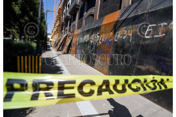 CIUDAD DE MÉXICO, 11NOVIEMBRE2025.- Tras el anuncio de diversas marchas en la capital, trabajadores de la ciudad y policías, colocan vallas metálicas en distintos puntos de la ciudad, para resguardar negocios y edificios. El Palacio Nacional luce amurallado. FOTO: ROGELIO MORALES/CUARTOSCURO.COM
