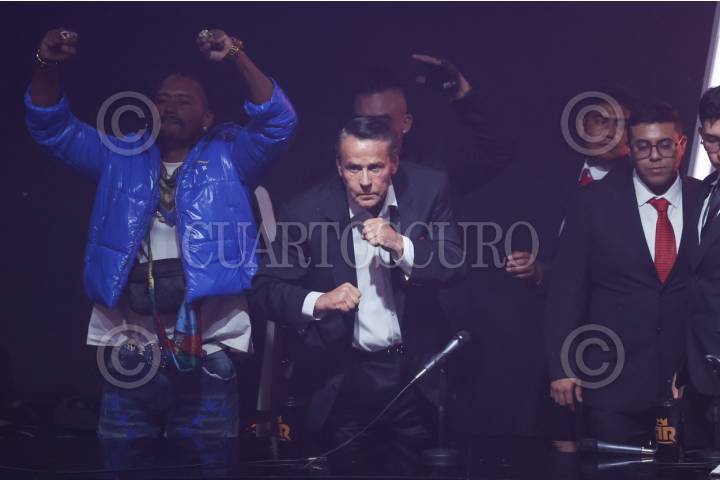 CIUDAD DE MÉXICO, 10FEBRERO2026.- El artista musical Abel "Abelito" Saenz y Bull Terrier durante el careo del evento Ring Royal, competencia de boxeo no profesional en que se enfrentarán influencers y personajes de la farándula, el próximo 15 de marzo en la arena Monterrey. FOTO: GALO CAÑAS/CUARTOSCURO.COM