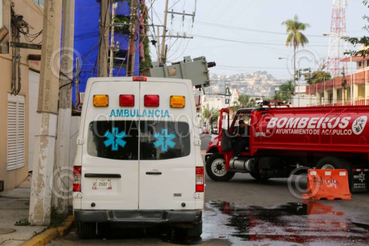 ACAPULCO, GUERRERO, 02ENERO2026.- Bomberos de Protección Civil de Acapulco, resguardan la calle Vasco Núñez de Balboa del fraccionamiento Hornos de Acapulco, en donde un transformador de luz cayó sobre una ambulancia en el hospital privado Santa Lucía, esto como consecuencia del sismo de 6.5 que esta mañana se registró en Acapulco con epicentro en el municipio de San Marcos, Guerrero. FOTO: CARLOS ALBERTO CARBAJAL/CUARTOSCURO.COM