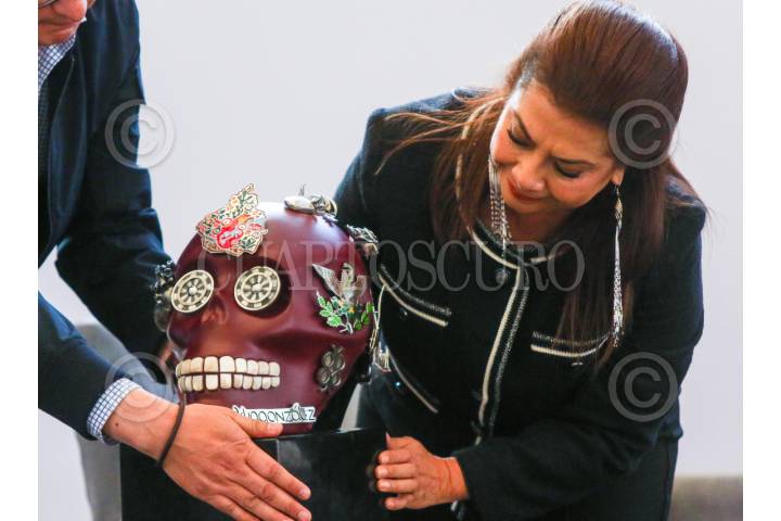 CIUDAD DE MÉXICO. 04NOVIEMBRE2025.-La jefa del Gobierno de la Ciudad, Clara Brugada Molina recibió de obsequio una calavera con alusiones a la ciudad de México, está tarde en el martes ciudadano en el Zócalo. FOTO: VICTORIA VALTIERRA/CUARTOSCURO.COM