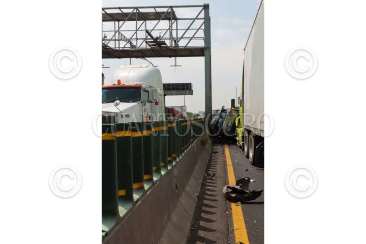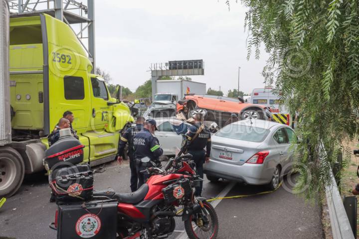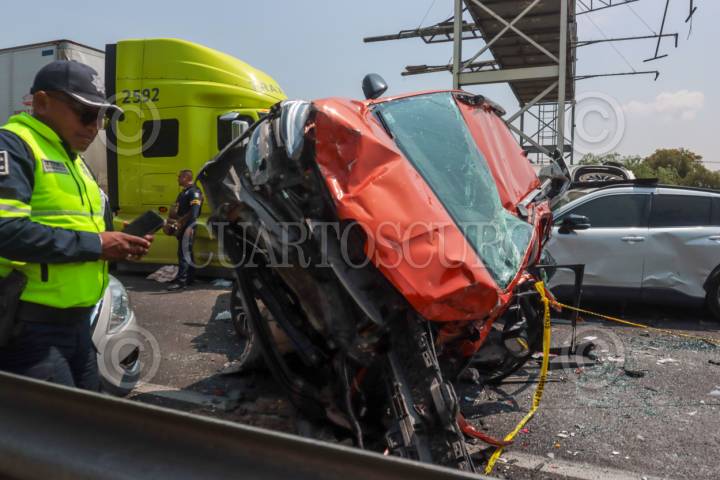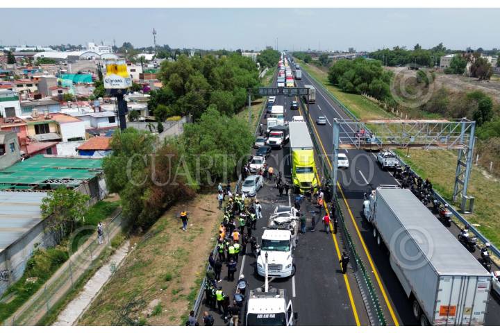 ECATEPEC, ESTADO DE MÉXICO, 20ABRIL2026.- Una carambola en donde se vieron involucrados 10 vehículos, dos de ellas unidades del servicio público de pasajeros y un tráiler, se registró en el Circuito Exterior Mexiquense (CEM), con saldo de una persona fallecida y al menos 13 lesionados. El accidente ocurrió a la altura del kilómetro 37, en la comunidad Bonito Ecatepec, en el tramo de la Macro Plaza de Tecámac y Las América en Ecatepec. Elementos de la Policía Estatal Protección Civil, Cruz Roja y paramédicos del Servicio de Urgencias del Estado de México, auxiliaron a las personas afectadas. FOTO: AXEL SÁNCHEZ/CUARTOSCURO.COM