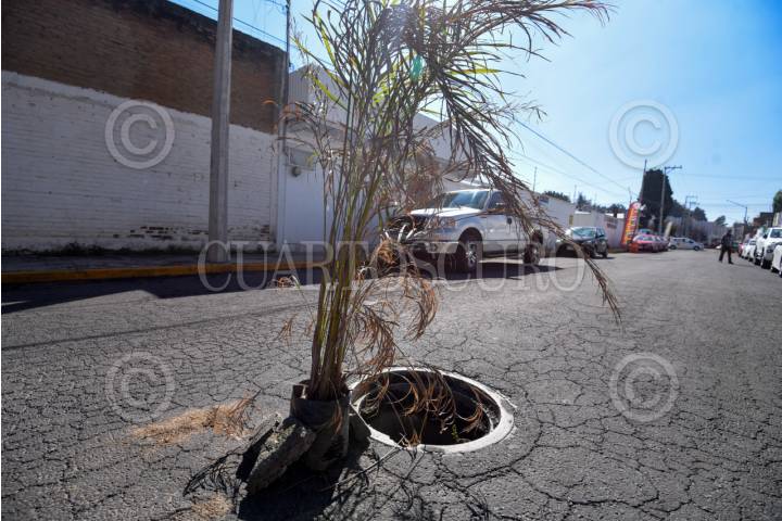 TOLUCA, ESTADO DE MÉXICO, 03FEBRERO2026.- Vecinos de la calle Carlos A. Vélez, en la colonia Universidad, alertan a conductores y peatones sobre la falta de una coladera en el lugar, esta situación, lleva dos semanas sin resolverse, persiste a pesar de los reportes realizados por los residentes. Como medida temporal, decidieron colocar una palma en el lugar para indicar la ausencia de la coladera. FOTO: CRISANTA ESPINOSA AGUILAR/CUARTOSCURO.COM