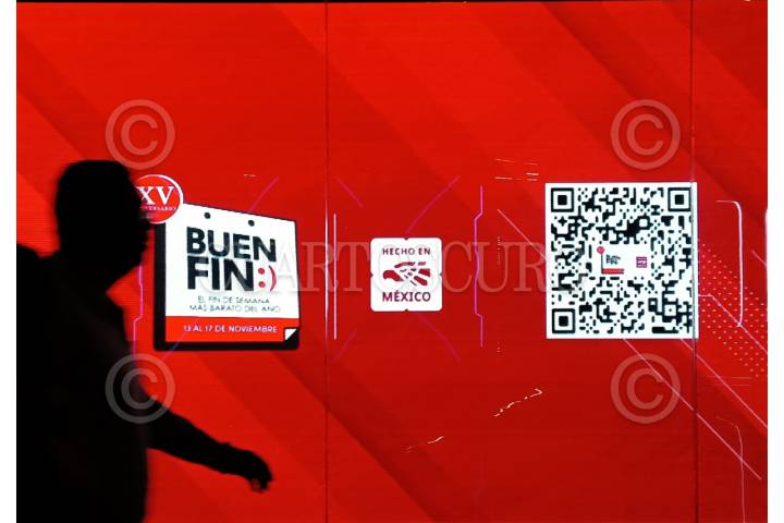 CIUDAD DE MÉXICO,16NOVIEMBRE2025.- Una persona pasa frente a uno de los letreros que promociona la décimo quinta edición del Buen Fin. FOTO: DANIEL AUGUSTO/ CUARTOSCURO.COM