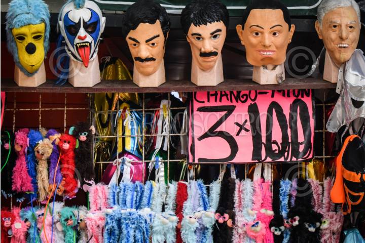 CIUDAD DE MÉXICO, 24ENERO2026.- Un puesto ubicado en el Bosque de Chapultepec, ofrece variedad de máscaras de distintos personajes y "changuitos miones" juguetes tradicionales del lugar. FOTO: MARIO JASSO/CUARTOSCURO.COM
